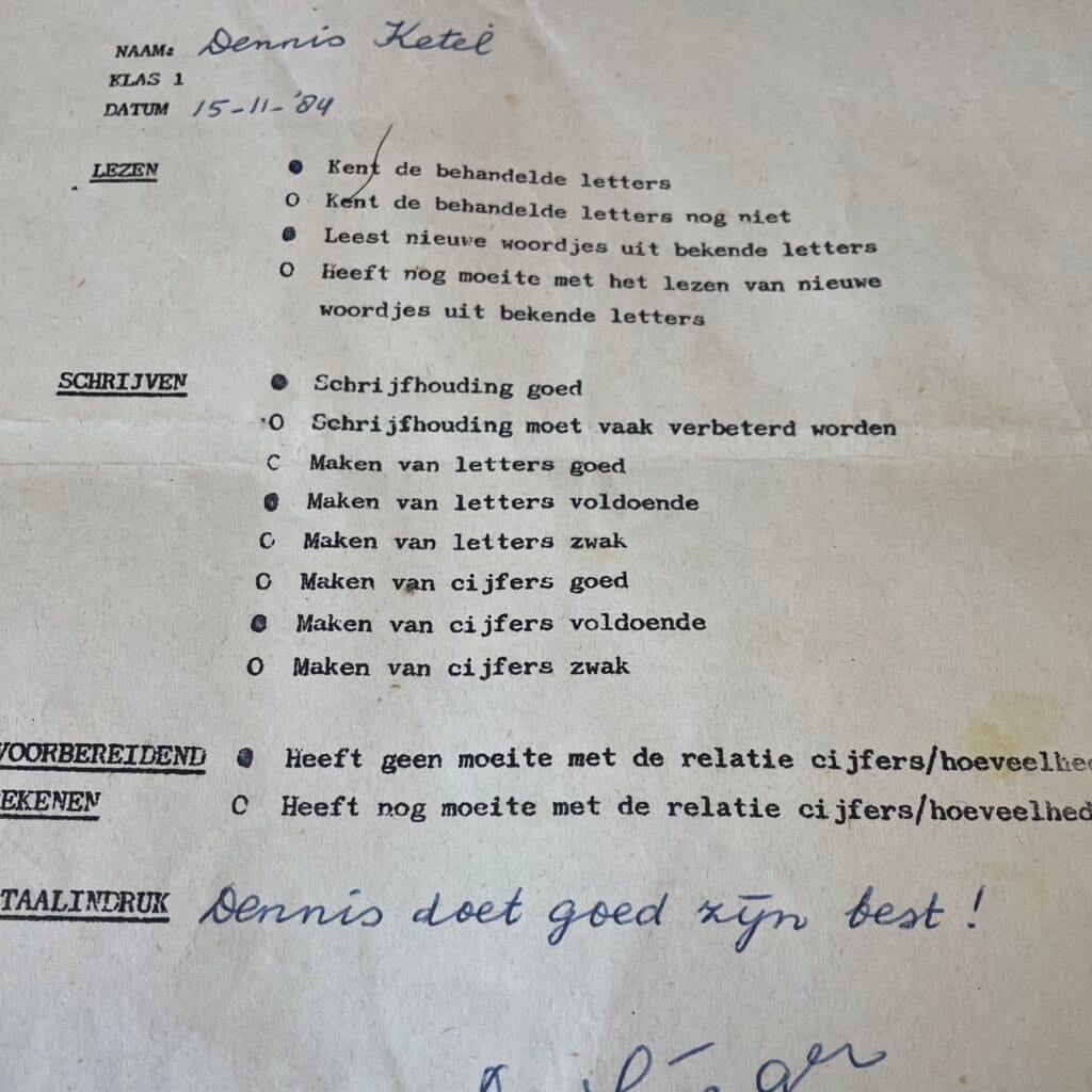 Ik vond onlangs nog een rapport terug uit de 1e klas (nu: groep 3) waar meester Vlieger als opmerking schreef “Dennis doet goed zijn best”. Maar waarom deed ik zo mijn best? Hoopte ik wellicht stiekem op erkenning van mijn moeder, of als ik zo hard zo werken mijn vader me misschien weer zou opzoeken? Zocht ik op die manier naar veiligheid? Hoopte ik stiekem dat iemand het zou zien? Vanuit de mechanismes, die ik inmiddels heb leren begrijpen en belichamen, waarschijnlijk allemaal. In een later rapport schreef hij dat een aai over mijn bol wonderen deed. Mooi dat hij dat toen al zag!